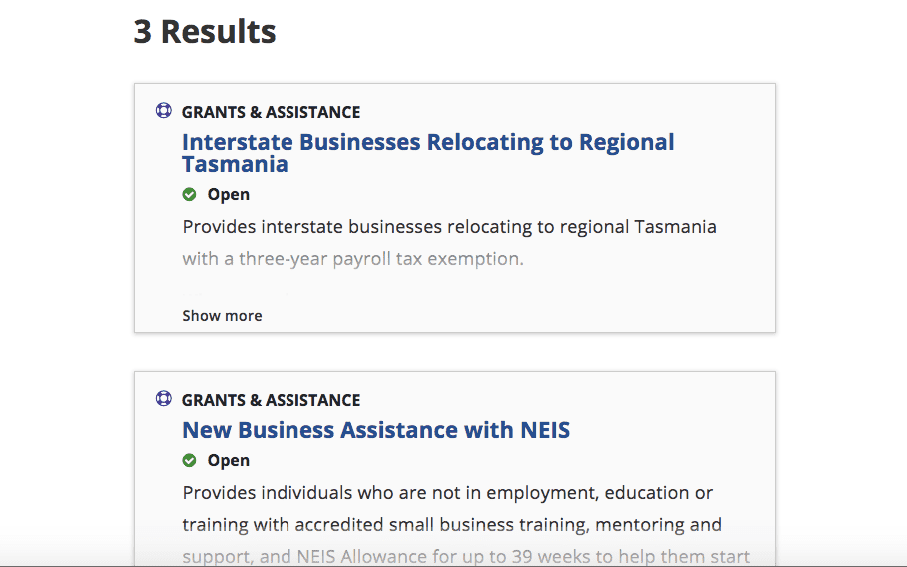 Visit the Grants and Assistance Programs section of Business.gov.au to get started. Enter information like your postcode, industry and business objectives, and you’ll see which programs you qualify for.